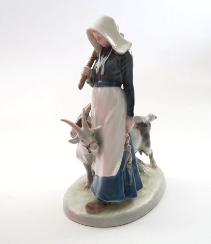 Royal Copenhagen figur #694, pige med geder på vej til folden med pælhammer. H. 23 cm., 1. sortering. Design Christian Tomsen.