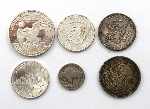 USA/ Danmark sølv, Dollar, Half Dollar, 5 Cent samt erindringsmønt (6)
