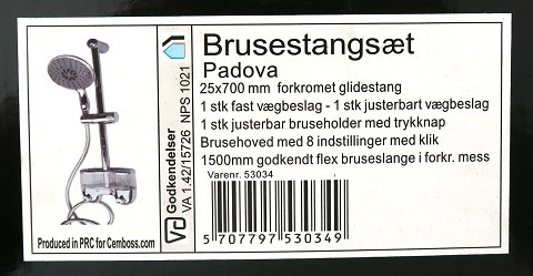 Justerbar vægbeslag 70 cm., brusehoved med 8 indstillinger.