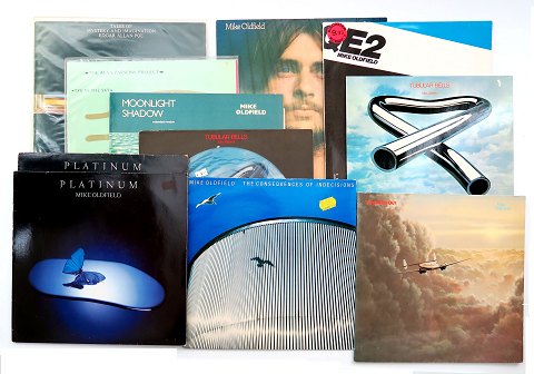33 1/3 RPM LP samling med Mike Oldfield: Ommadawn 1975 - QE2 1980 - Tubular Bells 1973 - 2x Platinum 1979 - The Cosequences of Indecisions u.å. - Tubular Bells (full colour vinyl) Virgin Edition 1973 - Moonlight Shadow 1983 - Five Miles Out 1982 samt Allan Parsons Project Tales of Mystery and Imagination Edgar Allan Poe 1976 og Eye in the Sky 1981.