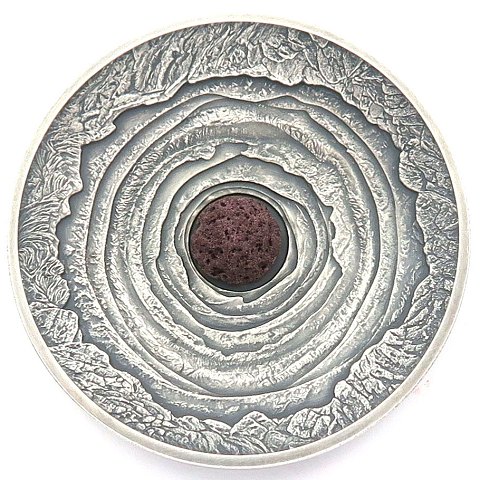 Niue Island, 2 Dollars 2 ounces finsølv 2014, revers med indstøbt magma fra vulkanen Erta Ale i Etiopien. Diameter 50 mm., 2 ounces finsølv.