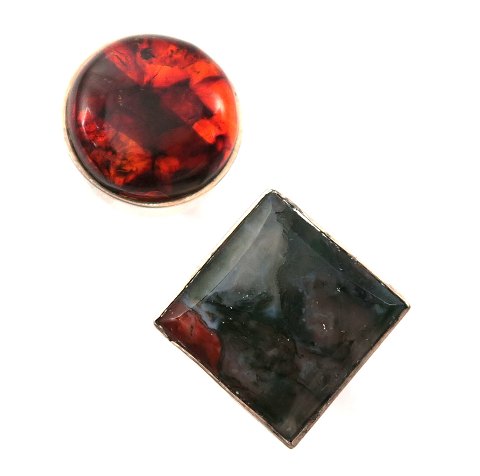 Lot bestående af Allan Børge Larsen designring af sterling sølv, prydet med ligesidet, poleret sten. Ring str. 57 samt åben Randers Sølvvare designring af sterling sølv, prydet med ravlignende pynt.