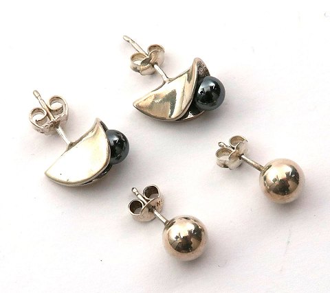 Lot bestående af par ørestikker af sterling sølv i bladform, prydet med hæmatitperle, samt par ørestikker af sterling sølv i form af sølvperle, diameter 7 mm.