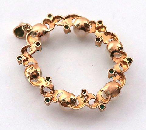 Broche af 18 kt. guld, prydet med 6 stk. 6 mm. kulturperler og turkisemalje. L. 46 mm., samlet vægt ca. 8 gr.