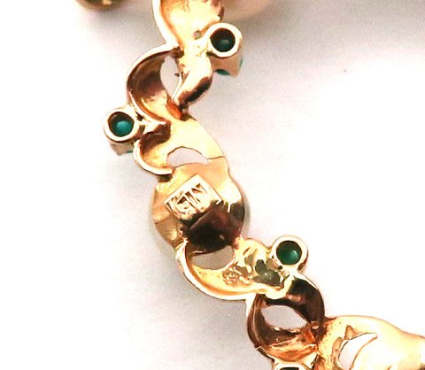 Broche af 18 kt. guld, prydet med 6 stk. 6 mm. kulturperler og turkisemalje. L. 46 mm., samlet vægt ca. 8 gr.