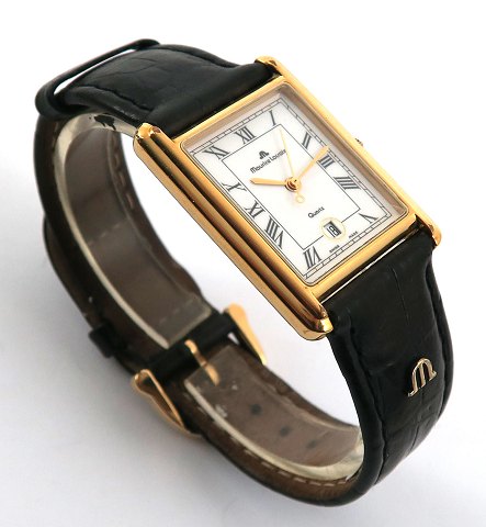 Maurice Lacroix damearmbåndsur, ref. nr. 82105-2 i rektangulær urkasse af delvist forgyldt stål. Krone prydet med chabochon sleben blå safir. Hvid emaille skive med romertal, central sekundviser og datovisning i #6 position. Quartzværk, urkasse 25 x 25 mm.