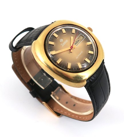 Zodiac Automatic, klassisk herrearmbåndsur i urkasse af delvist forgyldt stål. Guld/grøn tonet skive med stregindiaktion, central sekundviser og dag/dato visning i #3 position. automatisk værk. Urkasse diameter 40 mm.