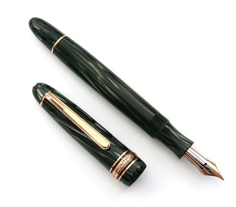 Mont Blanc Meisterstyk, fyldepen med grøn marmoreret, vintage celluloid hylster og nib af 14 kt. guld. Påfyldning med pumpeskrue. L. 13 cm. Fyldepennen fremstår brugt få gange.