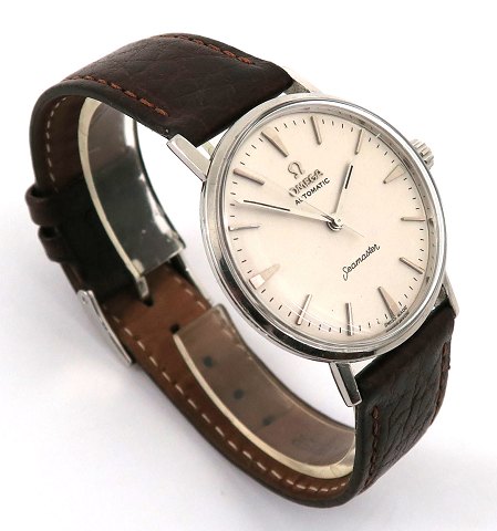Omega Seamaster Automatic vintage herrearmbåndsur, ref. nr. 17947463 i urkasse af stål. Metalgrå skive med Omega logo i relief, stregindikation og central sekundviser. Automatisk værk kaliber 591. Urkasse diameter 34 mm. Læderrem med Omega spænde.
