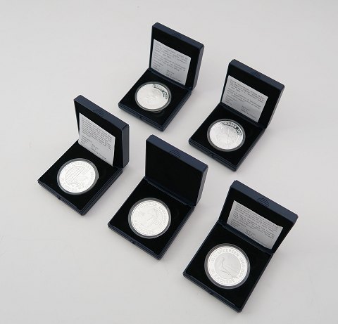 Lot bestående af 100 kr. finsølv *Isbjørn* præget 2007 i anledning af det internationale Polarår. 10 kr. finsølv *Den Grimme Ælling*, *Den Lille Havfrue*, *Snedronningen* samt *Nattergalen* præget 2005 - 2007 i anledningen af 200 året for H.C. Andersens fødsel.