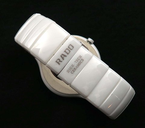 Rado Jubilé Unisex high tech armbåndsur i hvid, keramisk urkasse og med keramisk lænke. Hvid skive bag safirglas uden indikation , central sekundviser og stenomkranset datovisning i#6 position. Quartzværk. Urkasse diameter 40 mm.
