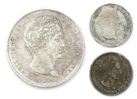 Lot bestående af Christian VIII, 1 Rigsbankdaler sølv 1847 VS og 2x 4 Rigsbankskilling sølv 1842 VS.