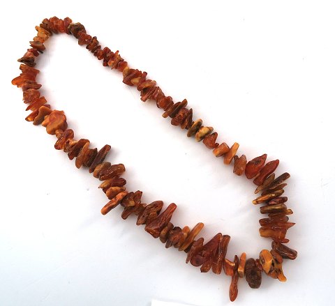 Ravkæde med ubearbejdede, polerede ravstykker i forløb