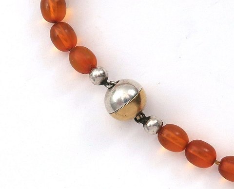 Ravkæde med Langer magnetlås af sølv og forgyldt sterling sølv, prydet med forarbejdede og polerede, bønneformede ravstykker. L. 48 cm., samlet vægt ca. 21 gr.