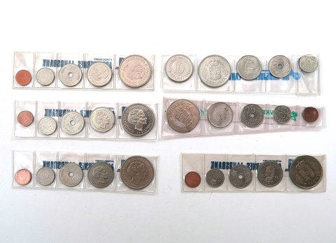 5 kr., 1 kr., 25 øre, 10 øre og 5 øre. 1973 fra Privatbanken, resten fra Arbejdernes Landsbank.