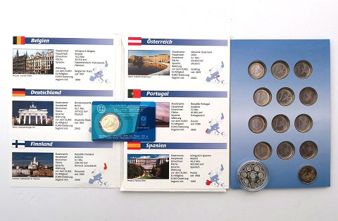 Mappe med 1 €uro mønter fra de 12 første Eurolande samt Frankrig 1½ Euro 2002 sølv (.900) og 2x Grækenland 2 Euro Olympiade mønt 2004, hvoraf den ene i originalt etui.