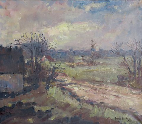 Mogens Vantore, signeret oliemaleri på lærred med motiv af huse i et landskab. 70 X 60 cm.