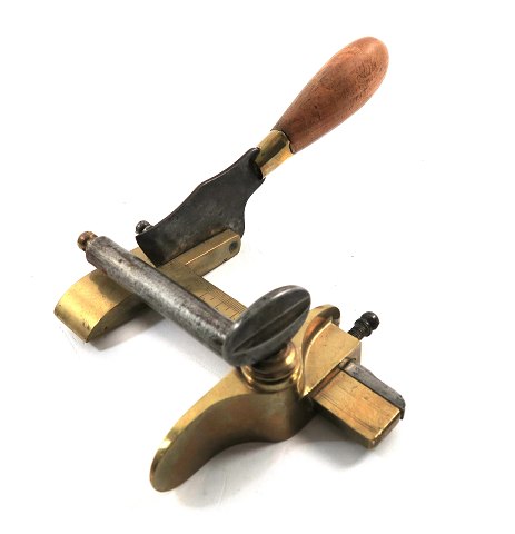 Antikt skæreværktøj af messing og jern med træhåndtag
