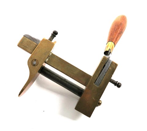 Antikt skæreværktøj af messing og jern med træhåndtag
