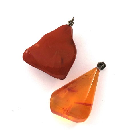 Vedhæng af forarbejdet mørkebrun rav og transparent rav (ambroid), L. 40 og 50 mm.. samlet vægt ca. 15 gr.