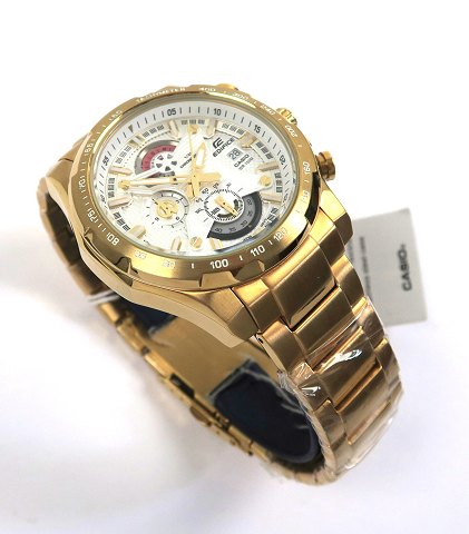 Casio Edifice Chronograph herrearmbåndsur, ref. EFR 523 i urkasse og med lænke af guldtonet mat stål. Lysegrå, struktureret skive med stregindikation, central sekundviser, datovisning i #3 position og chronograph funktioner. Quartsværk. Urkasse diameter 42 mm.