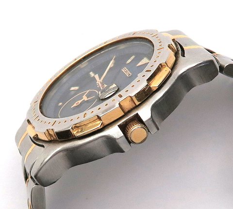 Seiko Sports 150 chronograph herrearmbåndsur, ref. nr. 6M 25-6000 i urkasse og med lænke af delvist guldtonet stål. Midnatsblå skive bag safirglas med stregindikation, central og separat sekundviser, datovisning i #3 position samt seprat viserindstilling for chronograph funktioner. Quartzværk, urkasse diameter 40 mm.