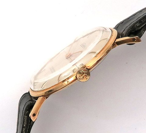 Küster, klassisk ultratynd herrearmbåndsur, ref. nr. 5911 i urkasse af forgyldt metal. Champagnefarvet skive bag plexiglas med stregindikation og arabertal. Manuelt mekanisk optræksværk, urkasse diameter 33 mm. Læderrem med metalspænde.