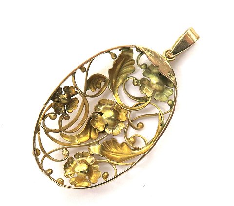 Ovalt vedhæng af 14 kt. guld, gennembrudt med blomster og bladværk. L. 54 mm., vægt ca. 9 gr.
