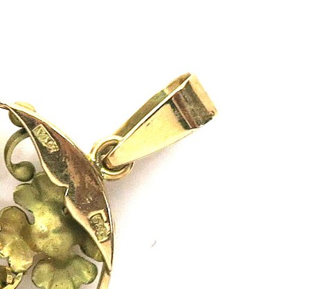 Ovalt vedhæng af 14 kt. guld, gennembrudt med blomster og bladværk. L. 54 mm., vægt ca. 9 gr.