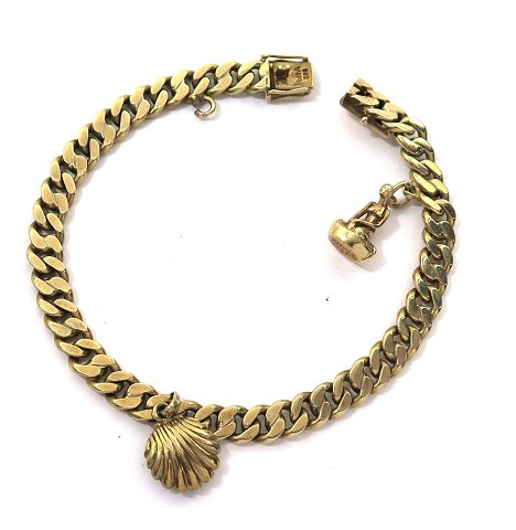 Maritim panser armlænke af 14 kt. guld, prydet med charms i form af den lille havfrue og musling med 4 mm. kulturperle. Kæde L. 18 cm., B. 6 mm., samlet vægt ca. 23 gr.