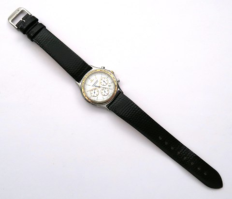 Jaeger LeCultre Chronographe armbåndsur, ref. nr. 115.5.31 i urkasse af stål med forgyldt skala ring. Hvid skive bag safirglas med stregindikation, central og separat sekundviser, datovisning i #4½ position, chronograph funktion. Quartzværk. Urkasse diameter 33 mm. Læderrem med JL metalspænde.