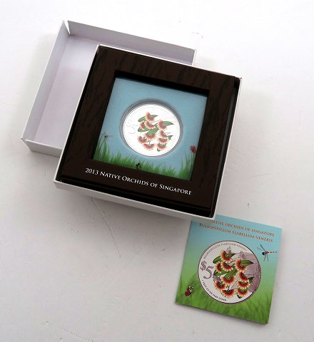 Singapore, $5, 2013, sølv, Proof, 1oz, Bulbophyllum Flabellum-Veneris, ORCHIDS OF SINGAPORE serien, med præsentationsæske og certifikat