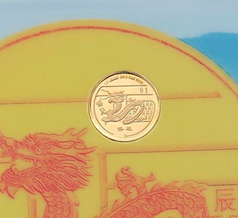 Singapore, $1, 2012, Lunar Dragon Gold Coin, 0.3 gr., , .999. Mønten monteret i etui i credit card-størrelse, som også fungerer som certifikat