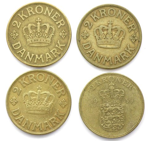 De fire bedste årstal for de gule 2 kr.: 1924, 1938, 1941 og 1959.
