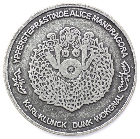 Satanmønt med portræt af Lucifer *13. maj 1973 Anholt - Lucifers Ø* og *Himmel og Helvede*, revers *Alice Mandragora - budbringeren mellem Gud og Djævelen 1973* Diameter 35 mm., vægt 15,5 gr.