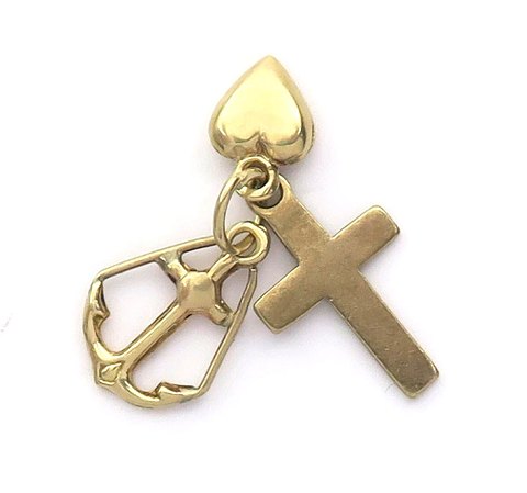 Tredelt symbol vedhæng af 14 kt. guld med hjerte, anker og kors. Kors L. 16 mm., vægt ca. 1,3 gr.