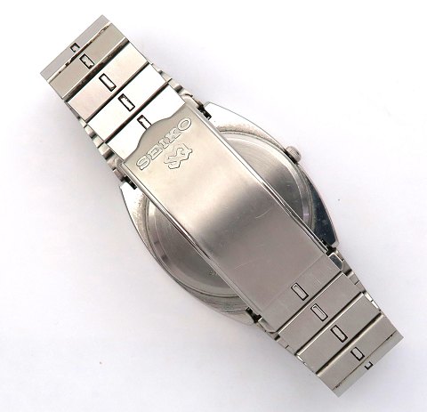 Seiko SQ herrearmbåndsur, ref. nr. 201610 i rektangulær urkasse og med foldelænke af stål. Aluminiumsgrå skive med stregindikation, central sekundviser og datovisning i #3 position. Quartzværk, urkasse 32 x 37 m.