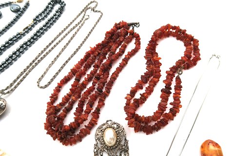 Lot bestående af halskæde og dobbeltradet halskæde af bearbejdet rav, L. 64 cm. og 44 cm., diverse hæmatit smykker, brocher, ørepynt og vedhæng.