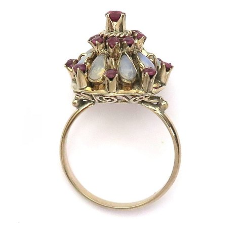 Ring af 14 kt. guld, prydet med 8 dråbeformede opaler, omkranset af oprindelig 16 mindre, facetslebne rubiner (2 rubiner mangler). Top ligeledes afsluttet med facetsleben rubin, diameter 3 mm. Ring Str. 54½, samlet vægt ca. 4 gr.