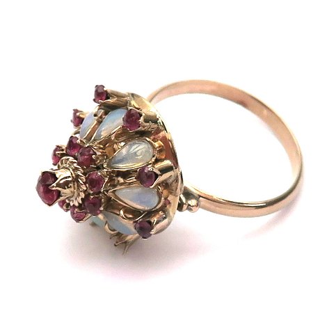 Ring af 14 kt. guld, prydet med 8 dråbeformede opaler, omkranset af oprindelig 16 mindre, facetslebne rubiner (2 rubiner mangler). Top ligeledes afsluttet med facetsleben rubin, diameter 3 mm. Ring Str. 54½, samlet vægt ca. 4 gr.