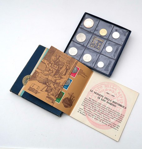 Sæt af 8 mønter fra lilleputstaten San Marino. Sættet medfølges af præsentationsæske og folder med San Marinos mønthistorie på italiensk. Indklæbet 8 frimærker med mønter afbilledet