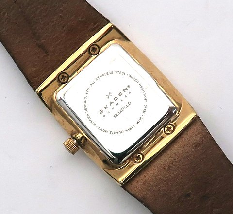 Skagen Denmark damearmbåndsur, ref. nr. 523XSGLD i rektangulær urkasse af guldtonet stål. Alufarvet relief skive med arabertal. Quartzværk. Urkasse 22 x 25 mm. Læderrem med metalspænde.