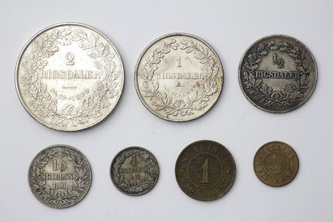 Frederik VII, sæt af 7 mønter, ½ skilling 1857, 1 skilling 1856, 4 skilling 1854, 16 skilling 1857, ½ Rigsdaler 1855, 1 Rigsdaler 1855 FF, 2 Rigsdaler 1854 FF(7)