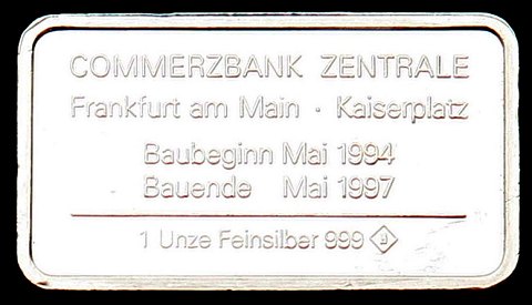 Sølvbarre, 1 ounce finsølv, Commerzbank Frankfurt nybyggeri 1994 - 1997.