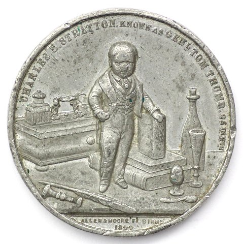 General Tom Thumb var kunstnernavnet for den amerikanske dværg Charles Sherwood Stratton, der levede 1838 – 1883. Han blev berømt for sin optræden i cirkus. Denne medalje viser blandt andet hans herskabelige karet. Diameter 38 mm.