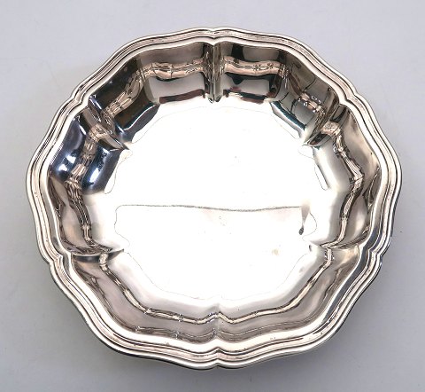 Rundt fad af sølv i barokform, ligeknækket korpus med buet, riflet og sveifet kant. Diameter 21 cm., vægt ca. 340 gr. Cohr 1942