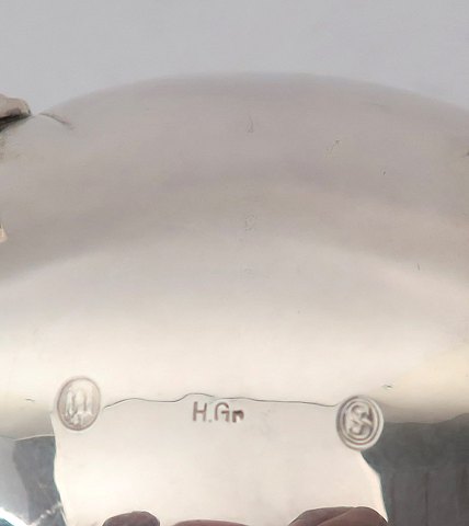 Dansk sauciere af sølv på fire løvefødder, dekoreret med volutter og akantusblade. L. 22 cm., vægt ca. 275 gr. Hugo Grün 1941