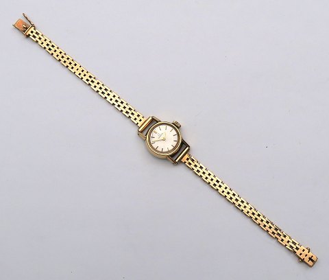 Omega dameamrbåndsur med murstenslænke af 14 kt. guld. Ur med champagnefarvet skive og stregindiakation og mekanisk optræksværk. Urkasse dameter 18 mm. Samlet vægt ca. 17,5 gr.
