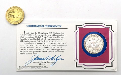 USA, frankeret og annulleret møntbrev med 5 Dollars 1995 cn og medalje af metal 1993 *Elvis Presleys 60 års fødselsdag - The King of Rock 'n' Roll*