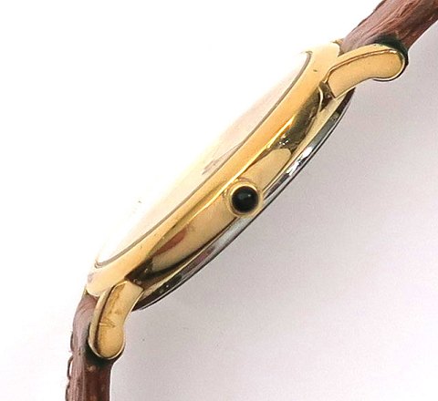 Citizen Quartz, klassisk damearmbåndsur, ref. nr. SE0102 i urkasse af guldtonet stål. Champagnefarvet skive med stregindikation. Quartzværk. Urkasse diameter 27 mm. Krone prydet med onyx. Læderrem med metalspænde.